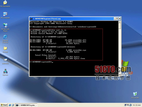4、根据服务名和可执行文件名字一般是相同的和绝大部分的服务程序或其他关键文件都放在system32下这一原则,先使用系统自带的dir命令查找该可疑服务的文件: