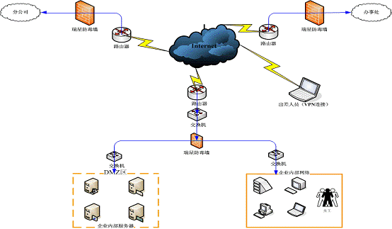 防毒墙通常部署在连接外部网络的路由器或交换机之前,利用一台硬件设备把网络病毒和黑客攻击隔绝在网络之外,能够满足各类企业复杂网络的基本需求。和传统的防病毒软件相比,瑞星防毒墙不仅配置简单,可以有效的减轻网络管理员的工作量,而且可以防止病毒肆意在网络中传播,让病毒无处藏身。防毒墙还可放置在企业内部,对一些特殊部门和重点服务器进行保护。防毒墙的部署只要遵循把安全区域和非安全区域隔离的思想就可,防毒墙即插即用,无须重定向路由的流向.