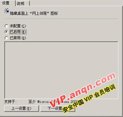 按照前面的方法打开组策略编辑器,然后在左侧选择“用户配置—管理模板—桌面”,再双击右侧的“隐藏桌面上的网上邻居图标”,在打开的窗口中将其设置为“已启用”项(图3),这样通过右击桌面上网上邻居图标的方式打开本地连接这条路就行不通了。