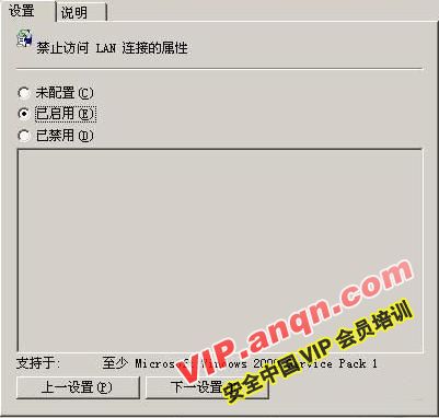 打开“运行”窗口,输入“gpedit.msc”后回车打开组策略编辑器,在打开的窗口左侧依次选择“用户配置—管理模板—网络—网络连接”,然后双击右侧的“禁止访问LAN连接的属性”项,在打开的窗口中将其设为“已启用”(图2),单击“确定”按钮保存设置,这样就无法打开本地连接的属性窗口,修改IP自然无从谈起了。