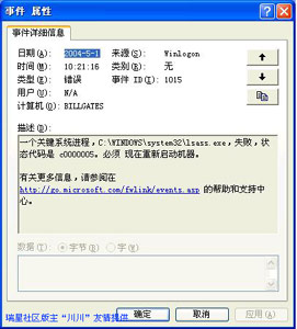 如果用户无法确定自己的电脑是否出现过上述的异常框或系统重启提示,还可以通过查看系统日志的办法确定是否中毒。方法是,运行事件查看器程序,查看其中系统日志,如果出现如下图所示的日志记录,则证明已经中毒。