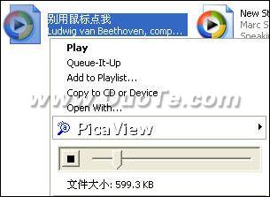 在音乐文件上右击,会有个mini播放器,用于试听。比打开音乐播放器的时间快多了哦~~