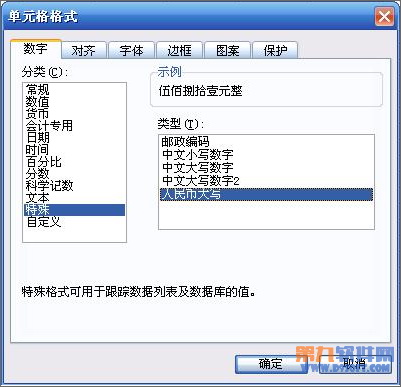 首先,光标定位在要设置为大写中文货币的单元格上;然后,点击‘格式’菜单中的‘单元格’,弹出‘单元格格式’对话框,在‘数字’选项卡的‘分类’栏中选择‘特殊’,然后在右边的‘类型’栏中选择‘人民币大写’