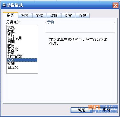 3、在‘数字’选项卡中‘分类’栏内,选择‘文本’后,单击‘确定’。