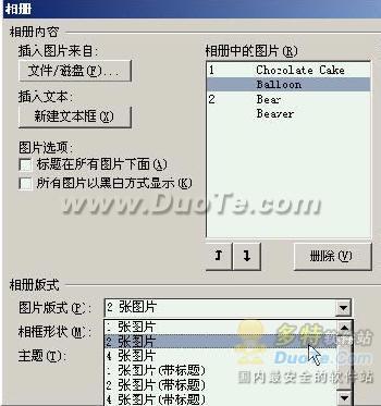 “相册中的图片”标明了图片的文件名,下面的上下箭头按钮可以调整图片顺序,删除按钮帮助我们挑选图片。