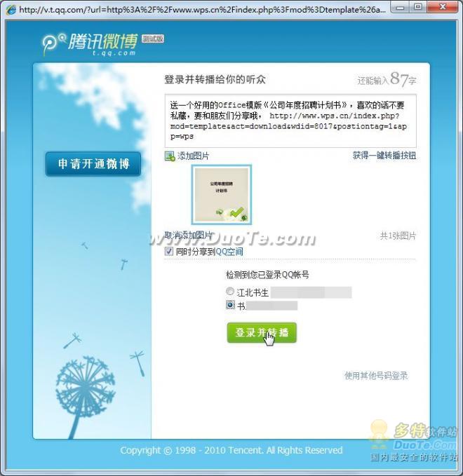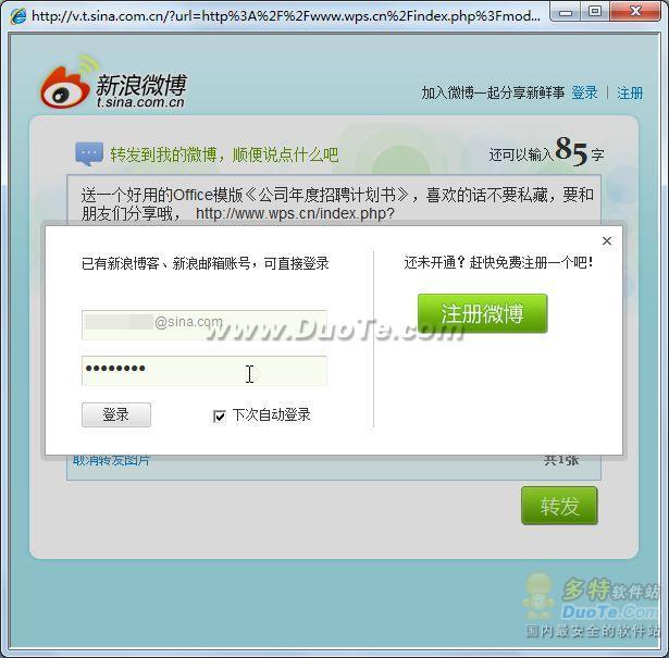 微博是现在非常流行的web2.0信息分享平台,WPS同时提供了两大微博服务平台的分享方式:新浪微博和腾讯微博,分别点击,在弹出窗口填写帐号之后就可以直接分享了(如图6、图7)。