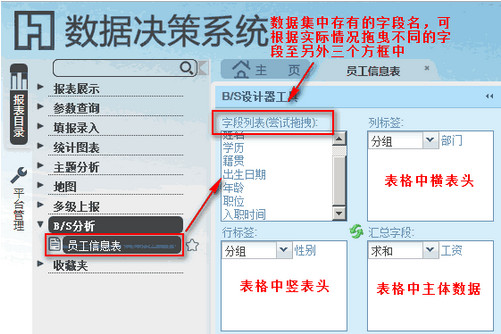 点开报表决策平台(op=fs)>B/S分析>员工信息表,给其添加新的数据分析,