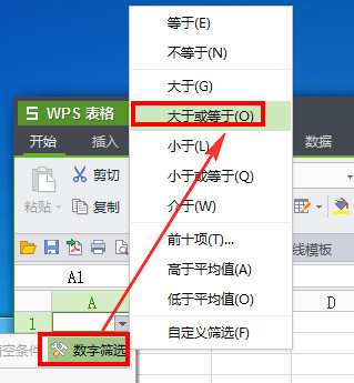2、单击“筛选按钮”,选择“数字筛选”,下拉菜单中选择需要筛选的选项