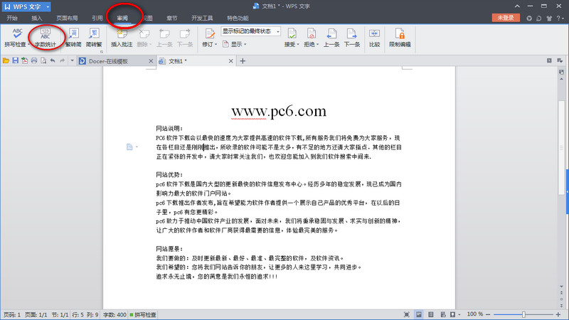 3、我们也可以在菜单栏点击“审阅”上面看到有一个“字数统计”的按钮