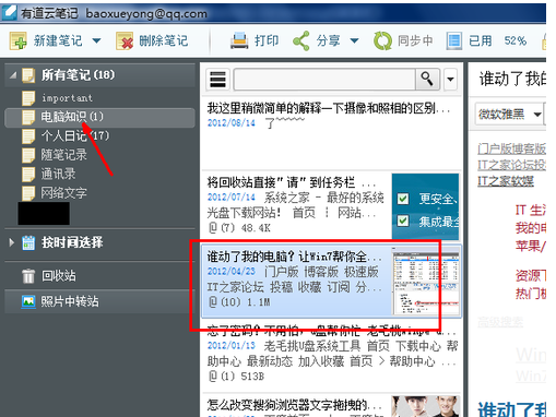 2、这便是云笔记的界面,里面的这些内容都是以前存储过的。而且在左边全部将它们进行了分类,当然是自定义的目录。