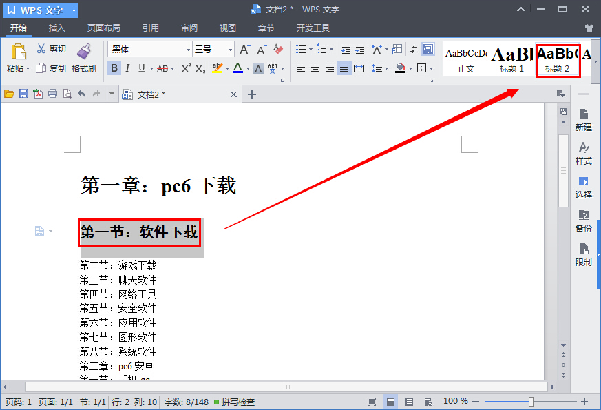 2.再选中第一节的标题,点击“标题二”。其他章节设置方法一样,章设置成标题一,节设置成标题二