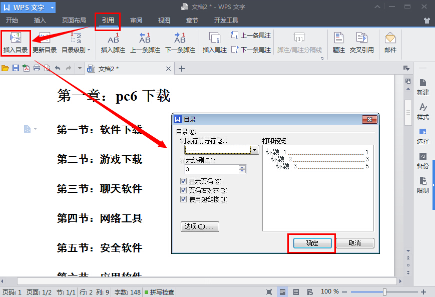 3.然后点击“引用”,选择“插入目录”,点击“确定”