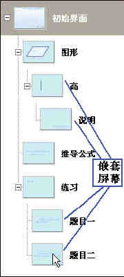 1.启动Flash 2004后,选择“创建新项目”下的“Flash幻灯片演示文稿”,此时将自动创建两个屏幕,分别为“演示文稿”和“幻灯片1”,其中“幻灯片1”是嵌套在“演示文稿”下面的,也就是“嵌套屏幕”。这样“幻灯片1”屏幕中的内容将会覆盖显示在“演示文稿”屏幕上。在“演示文稿”屏幕中绘制课件的背景和一些装饰物,并且放置两个按钮,用来实现幻灯片的上下翻页(如图1)。