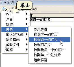 2.使用“利用模板”中所介绍的方法,根据需要插入屏幕(如图2)。按“Shift+F3”打开“行为”面板,选中“初始界面”的向上翻页按钮,然后如图3所示选择“转到前一幻灯片”。再将按钮的交互设置为“按下时”。使用同样的方法给“向下”翻页按钮加上“转到后一幻灯片”行为。在这里还可以添加更多的按钮,从而实现更多的交互,而且按钮的交互也有多种方式。