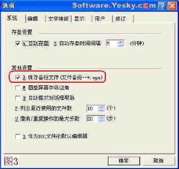 启动金山文字2003,执行“工具→选项”命令,打开“选项”对话框(如图3),切换到“系统”标签下,选中“保存备份文件(文件备份——*.wps)”选项,确定返回。