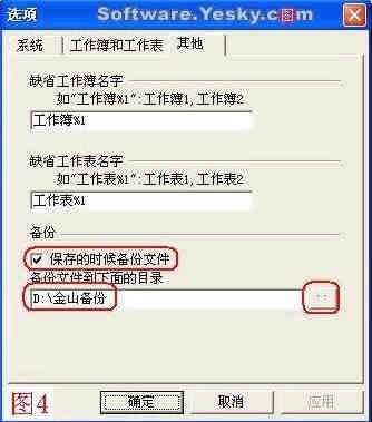 启动金山表格2003,执行“工具→选项”命令,打开“选项”对话框(如图4),切换到“其它”标签下,选中“保存的时候备份文件”选项,然后按“备份文件到下面的目录”选项右侧的按钮,指定一个文件夹(如D:\金山备份),再确定返回。
