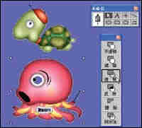 在Authorware中,我们对在显示图标中导入的图片设置背景透明的常用的方法是:双击选择工具,然后选择其中的透明(如图1)。这种方法非常简单,也很方便。但它的不足之处也是很明显的:我们看图1中的两张小动物的图片,这两幅图片原来的背景都是白色,设置了透明之后,动物的四周围都有白边,并不是很干净。而且第二张图片中,小章鱼的眼睛本来是白色的,因为白色背景被透明了,结果眼睛也透明了。而且,用这种方法使背景透明,只对白色背景有效,如果背景是其他颜色背景或者比较复杂,就无能为力了。