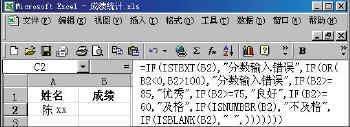 说明:这里应用了IF函数的嵌套,如果第一个逻辑判断表达式“ISTEXT(B2)”为真时,在C2中就显示“分数输入错误”,如果为假,就执行第二个IF语句;如果第二个IF语句中的逻辑表达式“OR(B2<0,B2>100)”为真,在C2中就显示“分数输入错误”,如果为假,就执行第三个IF语句中的逻辑表达式……依此类推,直至结束。整个IF语句的意思是:当您在B2单元格输入的内容是文字时,在C3单元格就显示“分数输入错误”;当您输入的数值比0小或者比100大时,也显示“分数输入错误”,当B2的数值大于或等于85时就显示“优秀”,当B2的数值大于或等于75时就显示“良好”,当B2的数值大于或等于60时就显示“及格”,如果是其他数值就显示“不及格”;如果B2单元格内容为空,那么C2也为空。