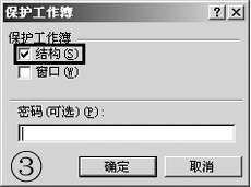 实现方法:执行“工具→保护→保护工作簿”,出现如图3所示的对话框,选中“结构”选项,同时可以设置保护密码。