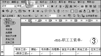 4.把光标置于要插入相应项目的位置,点击“插入合并域”下拉菜单(下拉菜单中的相应选项与“x月工资.xls”表格中的标题行是一一对应的),然后单击下拉菜单中的相应选项,直至操作完毕(如图3)。