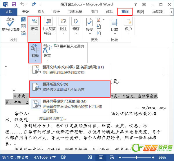 1、用Word2013打开一篇文档,选中我们需要翻译的文本,然后切换到“审阅”选项卡,并执行“语言”选项组下的“翻译”命令,在展开的下拉菜单中选择“翻译所选文字”选项。