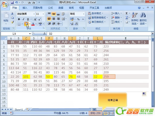 ③下面,我们来验证一下函数公式计算的对不对,将第9行三、六、九、十二4个月份的数据以黄色颜色,按住Ctrl键选中,在下方的状态栏中可以查看到求和结果为259,证明我们的公式计算准确无误。
