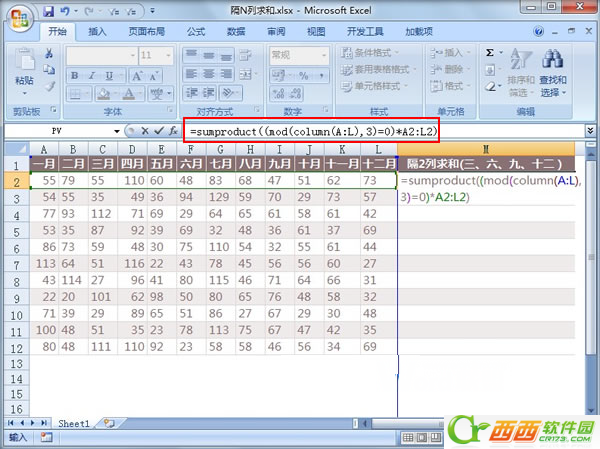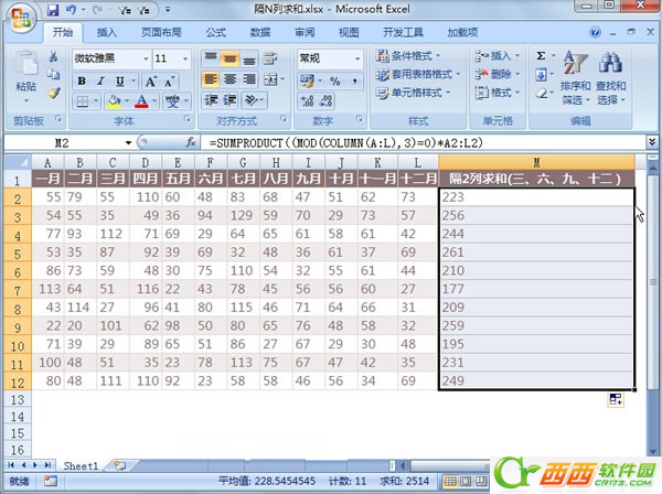 ①首先启动excel2007,打开含有数据的表格,一年之中十二个月的数据情况,我们要隔2列进行求和,例如三、六、九、十二,说起求和,函数公式必不可少,我们不要怕这些,在M2单元格输入下图中的公式,进行隔2列求和。