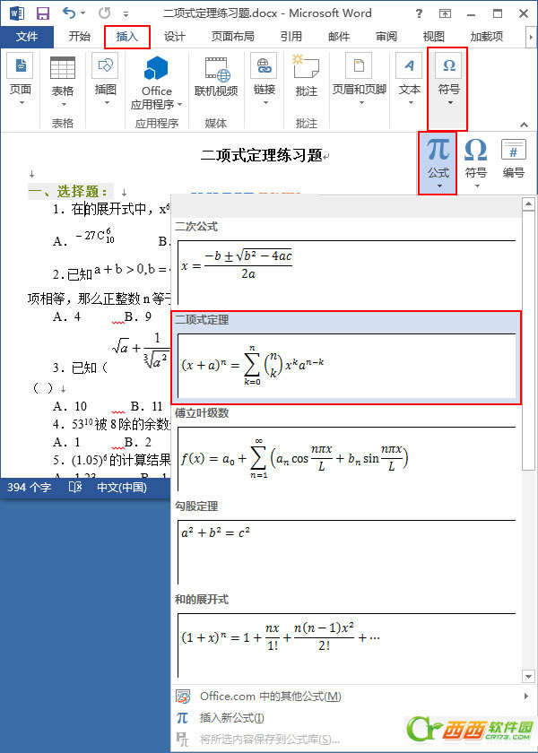 1、用Word2013打开一篇文档,将光标定位到我们需要插入公式的位置,并切换到“插入”选项卡,我们现在选择“符号”选项组中的“公式”命令,然后就可以根据自己的需要插入公式了。例如,我们现在选择“二项式定理”。