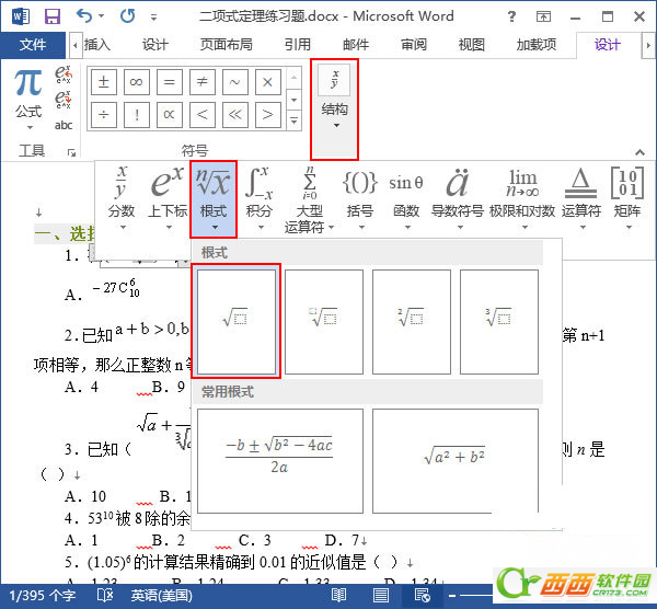 2、此时,文档中已经插入二项式定理的标准形式,并自动切换到“公式工具->设计”选项卡,我们可以根据自己的需要设计公式。例如,我们现在需要的是“(x-√3)^10”,则可以先将标准形式修改为“(x-3)^10”,再选中“3”,然后单击“结构”组中的“根式”选项,选择“平方根”。