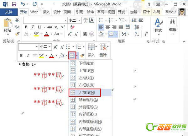 ⑥下面再次选中整个表格,点击工具栏上的边框按钮,选择无边框。
