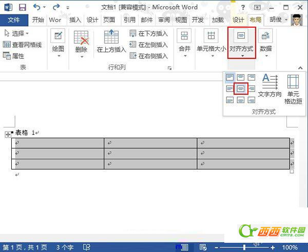 ②插入之后,选中整个表格,单击布局选项卡中的对齐方式,将其设置为居中对齐。