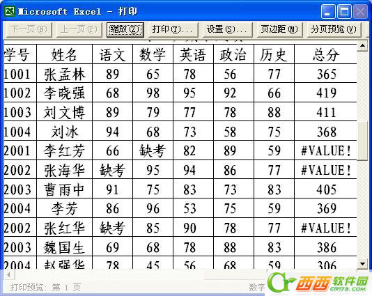 最近帮一位童鞋用EXCEL将其班学生的各科成绩处理完毕后,通过打印机输出时有几名学生的总分处输出为“#VALUE!”(如图1),很不美观。西西告诉大家这是因为这几名学生由于各种原因缺少某科成绩,用公式求总分时造成对应总分处显示“#VALUE!”的错误信息。通过西西的摸索发现利用 EXCEL的“错误单元格的打印”操作完全可避免上述问题。
