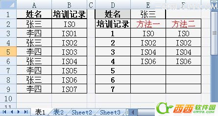 在列A和列B中存在一系列数据(表中只是示例,可能数据还有很多),要求找出某人(即列A中的姓名)所对应的所有培训记录(即列B中的数据)。也就是说,在单元格E1中输入某人的姓名后,下面会自动显示这个人所有的培训记录。