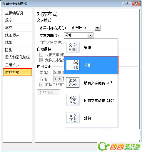 2、进入“设置坐标轴格式”对话框,单击“对齐方式”,从“文字方向”的下拉菜单中选择“竖排”或者你喜欢的显示方式。按“关闭”按钮。