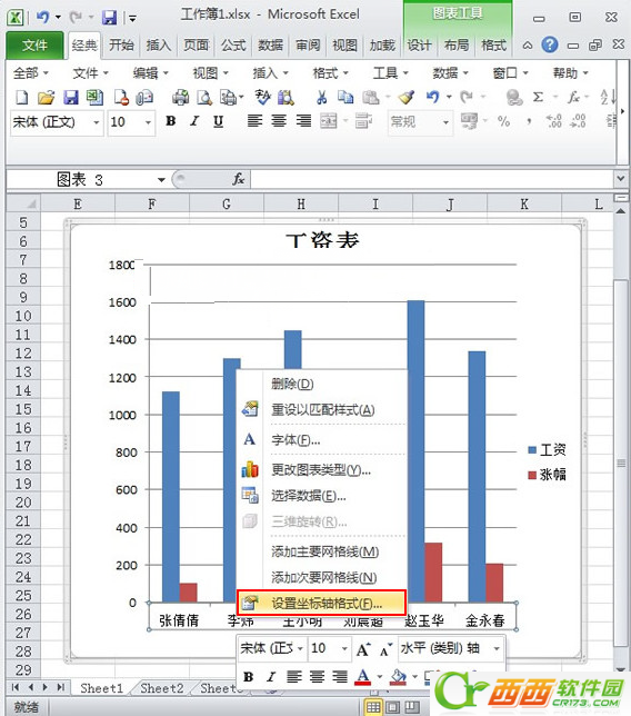 1、打开一个制作好的图表,选中进行设置的分类轴,单击鼠标右键,从下拉菜单中选择“设置坐标轴格式”选项。
