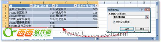 2、在随即打开的“套用表格式”对话框中,选中“表包含标题”复选框,然后单击【确定】按钮,则选中的数据区域将应用对应的表样式,同时识别出列标题行,如图2所示。