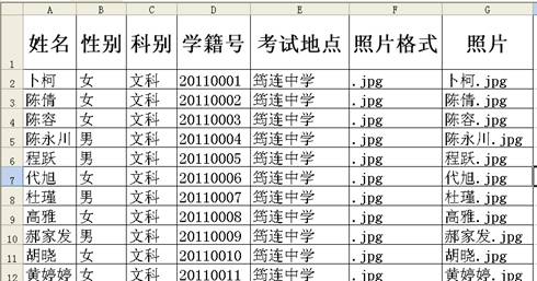 一、准备工作:准备一份Excel的学生信息数据。需要注意的是:在使用Excel工作簿时,必须保证数据文件是数据库格式,即第一行必须是字段名,数据行中间不能有空行等。比如第一行里面包含了编号、准考证号、考生姓名及其他相关信息的字段,要批量打印照片的话,还需要加一个照片格式和照片名(照片名必须与学生姓名一致,“照片”的输入如下图所示,单击G2,在G2的编辑栏中输入“=A2&F2”后敲回车键,再双击单元格进行自动填充即可)。数据准备工作的正确与否,关系到以后打印出来的证件正确与否,所以必须要仔细校对检查。