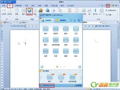 上网冲浪前记得先运行WPS 2012文字工具,点击右上角的“素材库”按钮,或者点击功能区“插入”选项卡的“插图”功能组中的“素材库”按钮,打开“Wps素材库”。别忘了点击左下角的“网页抓取已关闭”,开启网页抓取功能。
