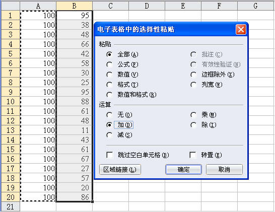 3. 右击A列,从快捷菜单中选择复制。然后右击B列,从快捷菜单中选择选择性粘贴,从对话框的运算区域选择加,进行加法运算,单击确定。