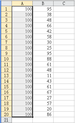 2. 将鼠标指针放置于单元格A1右下角的填充柄处,等其变为十字形后按住Ctrl向下拖拉,直至所需的位置,此时A列中所有的数据都为100。