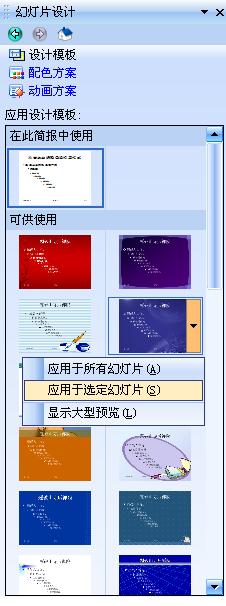 3.在应用设计模板中选择要应用到某一张幻灯片的模板,然后单击模板右侧出现的下拉箭头,选择应用于选定幻灯片即可;