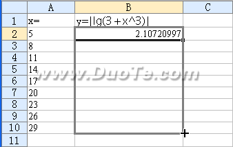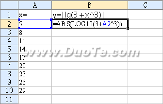 4.接下来就利用函数ABS来求得A2对应的函数值。在B2单元格中输入公式“=ABS(LOG10(3+A2^3))”,回车后,B2单元格中会得出计算结果。
