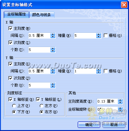 8.选中座标轴,右击鼠标,从弹出的快捷菜单中选择“设置坐标轴格式”,弹出其对话框。按照下图所示,调整主刻度的间隔、增量;次刻度的个数等。