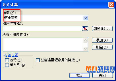 步骤1:选取sheet3表格的A1单元格,excel2003版里,执行数据菜单(excel2010版 数据选项卡) - 合并计算。在打开的窗口里“函数”选“标准偏差”,如下图所示。