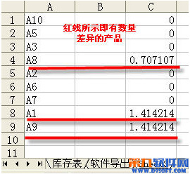 进行以上步骤后,点确定按钮,会发现sheet3中的差异表已生成,C列为0的表示无差异,非0的行即是我们要查找的异差产品。