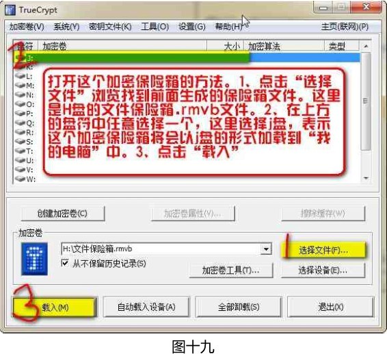这一步是关键。程序界面打开后。这个界面就是通向那个文件保险箱的大门哦。按照如图十九的方式加载这个文件保险箱。加载后,这个保险箱会以一个盘符的形式显示。比如我选择了 J 盘盘符。你可以像打开D 盘,E 盘那样打开J 盘这个文件保险箱,迚入它的内部。(注意哦一定要先选择一个盘符哦。选择的盘符就是后面这个保险箱显示的盘符)