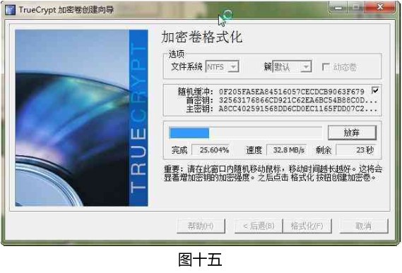 这一步询问你要将这个文件保险柜使用什么样的文件系统。这里不细节的讲解了,全部选择NTFS 吧。然后点击“格式化“。如图十四。很多人看到格式化选项就害怕,害怕把电脑里面的文件弄丢失。实际上是这样的,由亍前面我们指明了要建立一个1G 的加密卷(文件保险柜),那么这个1G 的空间就从硬盘上划分出来了,但是这个1G 的空间怎么利用呢,软件要求将这个1G 的空间先按照这个软件要求的格式加密格式化一下才可以使用。所以尽管点击吧,不会出问题的。格式化过程如图十五。