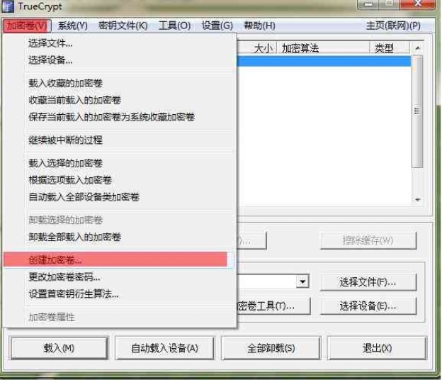 在打开的程序窗口中,选择菜单“加密卷”“创建加密卷”。(软件中将我前面说的文件保险柜叨“加密卷”的。我觉得文件保险柜更容易理解。所以我称之为“文件保险柜”。不过你为了适应软件,你要知道软件中所谓的加密卷是什么哦。) 如图六。