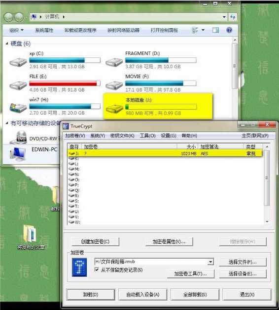 一次点击确定后就将保险箱加载好了。如图二十一是加载好之后的样子。可以看出“我的电脑”内部多出了一个J 盘。在TrueCrypt 软件中可以显示(黄色高亮部分)大小为1023MB。