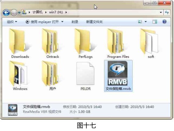 好了,加密保险箱生成了,看上去就像个普通文件,可以将它剪切到硬盘的任何地方。如图十七。你一定再想怎么打开它。直接用播放电影的软件是不能打开它的哦。怎么打开它,以及怎么往里面放文件我们下一部分讲解。